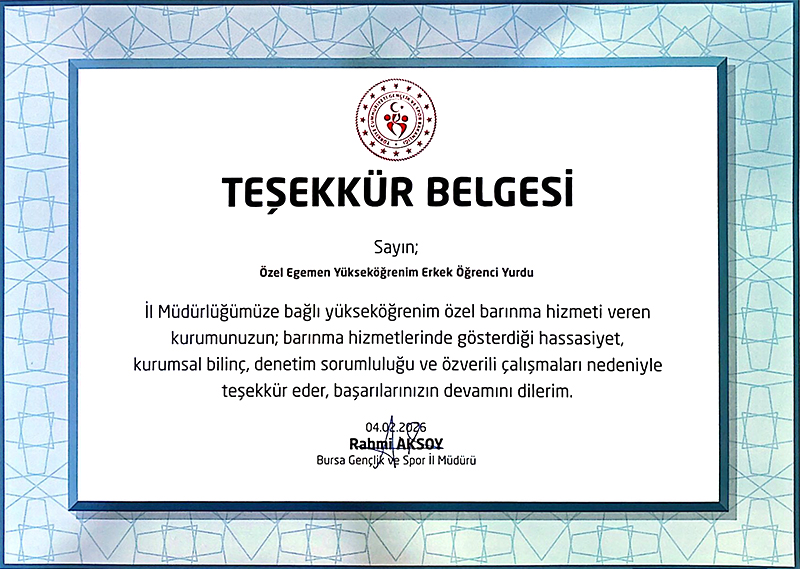 Bağlı bulunduğumuz Bursa Gençlik ve Spor İl Müdürlüğümüz tarafından düzenlenen Öğrenci Yurtları Toplantısında, sunmuş olduğumuz hizmetler ve standartlara tam uyumdan dolayı bize takdim etmiş oldukları TEŞEKKÜR BELGESİNİ almanın gururunu yaşıyoruz.
